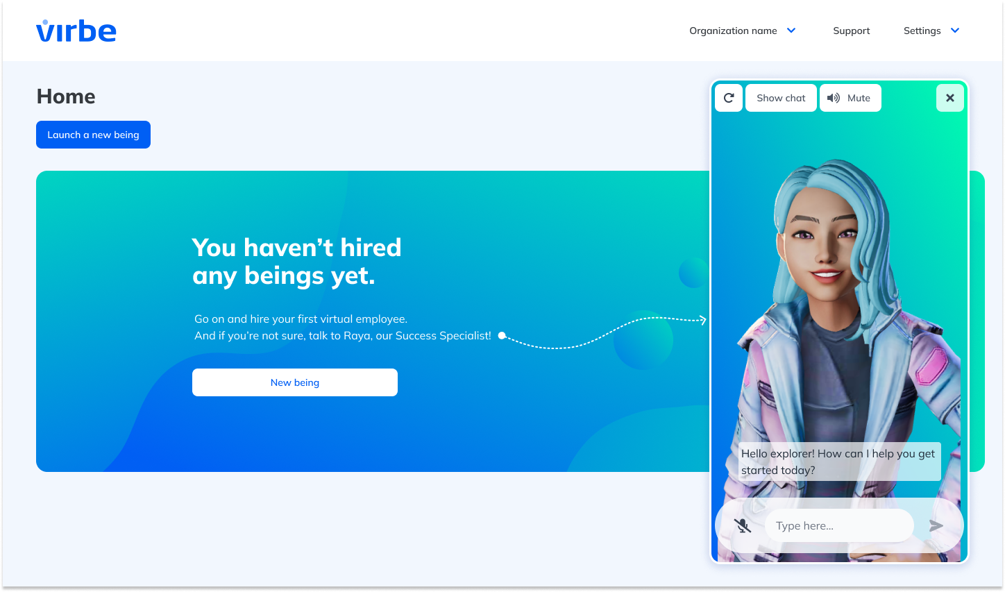 The Virbe Hub is your central workspace for managing all virtual beings in your organization. Here you can create, manage, and monitor all your virtual employees from one place.&#x20;